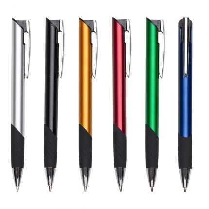 Caneta plástica corpo branco com detalhes coloridos. Clip plástico e detalhe inferior emborrachado com relevo, acionador e ponteira prateada(plástico). Aciona